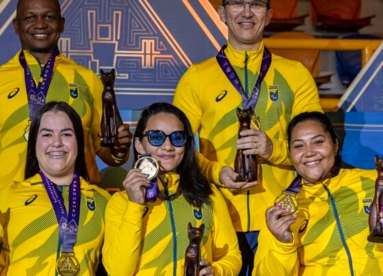 A equipe feminina do Brasil (formada por Mariana D’Andrea, Lara Lima e Tayana Medeiros) garantiu a medalha de ouro no…
